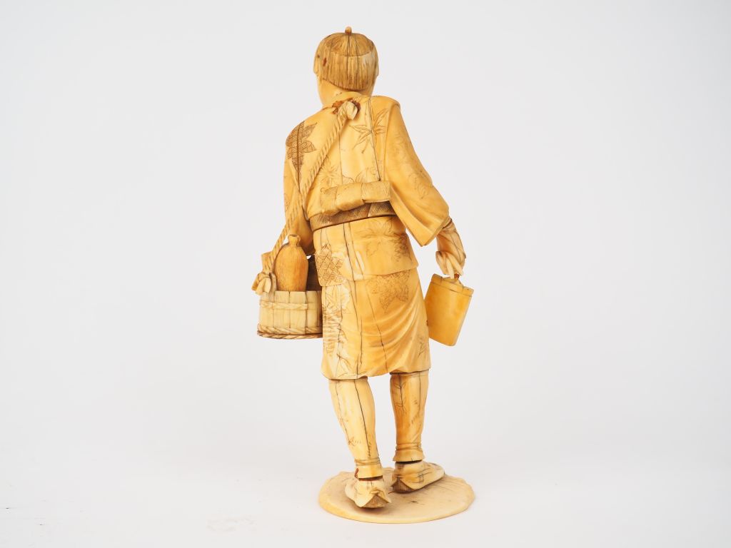 Okimono en ivoire du Japon XIXème "Le peintre" Poids : 655 g (petits accidents) H. 25 cm Nom scientifique de l’ivoire : ivoire d’éléphant Elephantidae spp (I/A, pré-convention), spécimen antérieur au 1er juin 1947 et conforme à la réglementation CE 338/97 du 09/12/1996, art. 2-W mc. Pour une sortie de L’UE, un CITES de ré-export sera nécessaire, celui-ci étant à la charge de l’acquéreur.