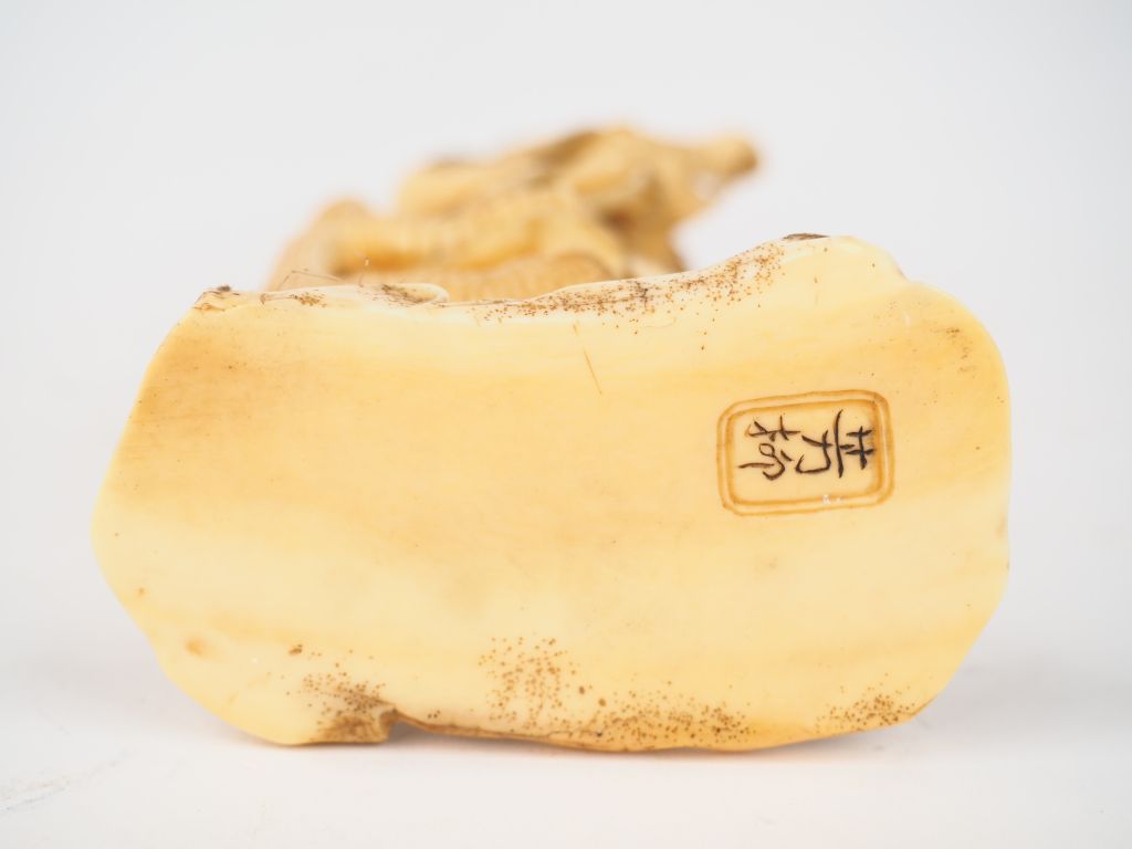 Okimono en ivoire du Japon XIXème 'personnage mythologique et serpent", socle en os. Poids : 357 g H. 19,5 cm (petits accidents) Nom scientifique de l’ivoire : ivoire d’éléphant Elephantidae spp (I/A, pré-convention), spécimen antérieur au 1er juin 1947 et conforme à la réglementation CE 338/97 du 09/12/1996, art. 2-W mc. Pour une sortie de L’UE, un CITES de ré-export sera nécessaire, celui-ci étant à la charge de l’acquéreur.