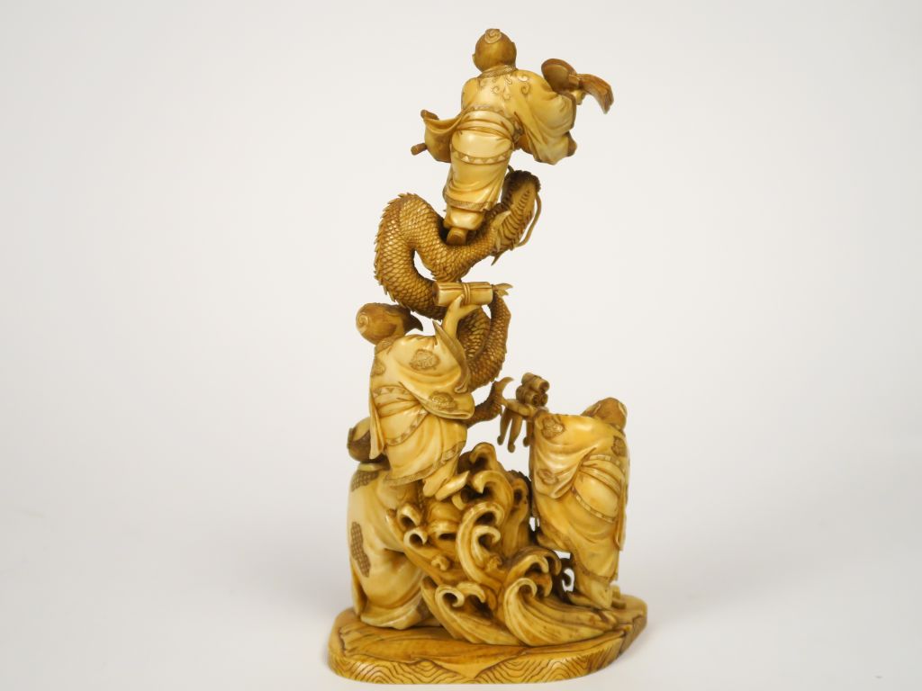 Okimono en ivoire ‘Groupe de sages entourant un dragon’. Japon, vers 1900 H. 25 cm Poids : 612 g Nom scientifique de l’ivoire : ivoire d’éléphant Elephantidae spp (I/A, pré-convention), spécimen antérieur au 1er juin 1947 et conforme à la réglementation CE 338/97 du 09/12/1996, art. 2-W mc. Pour une sortie de L’UE, un CITES de ré-export sera nécessaire, celui-ci étant à la charge de l’acquéreur.
