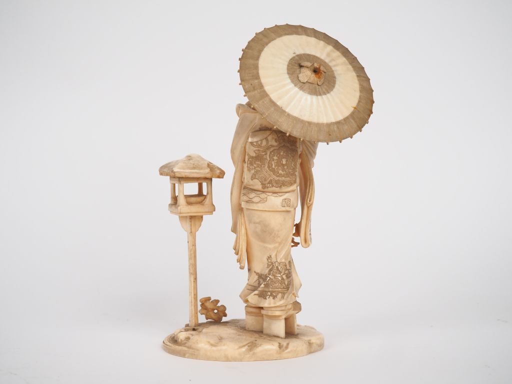 Okimono en ivoire Jeune femme à l'ombrelle et au bouquet de fleurs. Elephantidae spp Dimensions. 21 x 10,5 x 9 cm. Poids total : 519 g Pré convention : Japon période Peiji, vers 1880. Importation supposée : milieu Xxème Un certificat CIC délivré par la DREAL occitanie sera délivré avec la pièce.