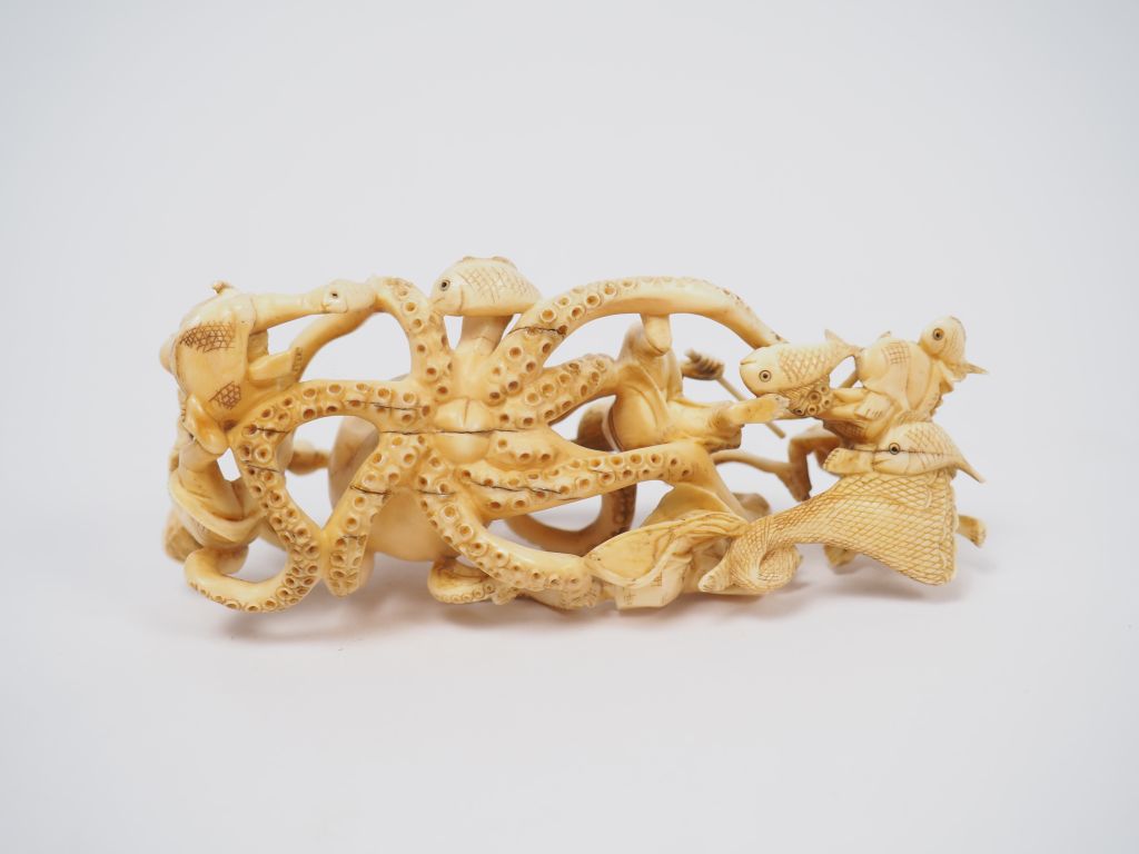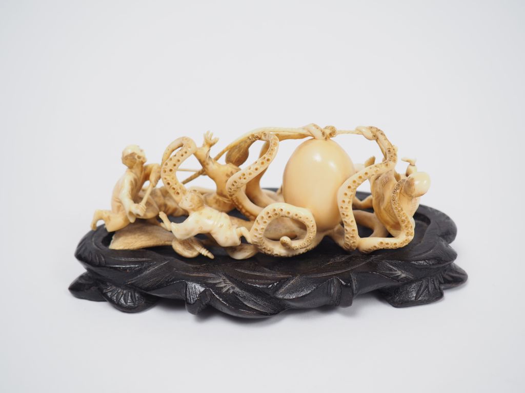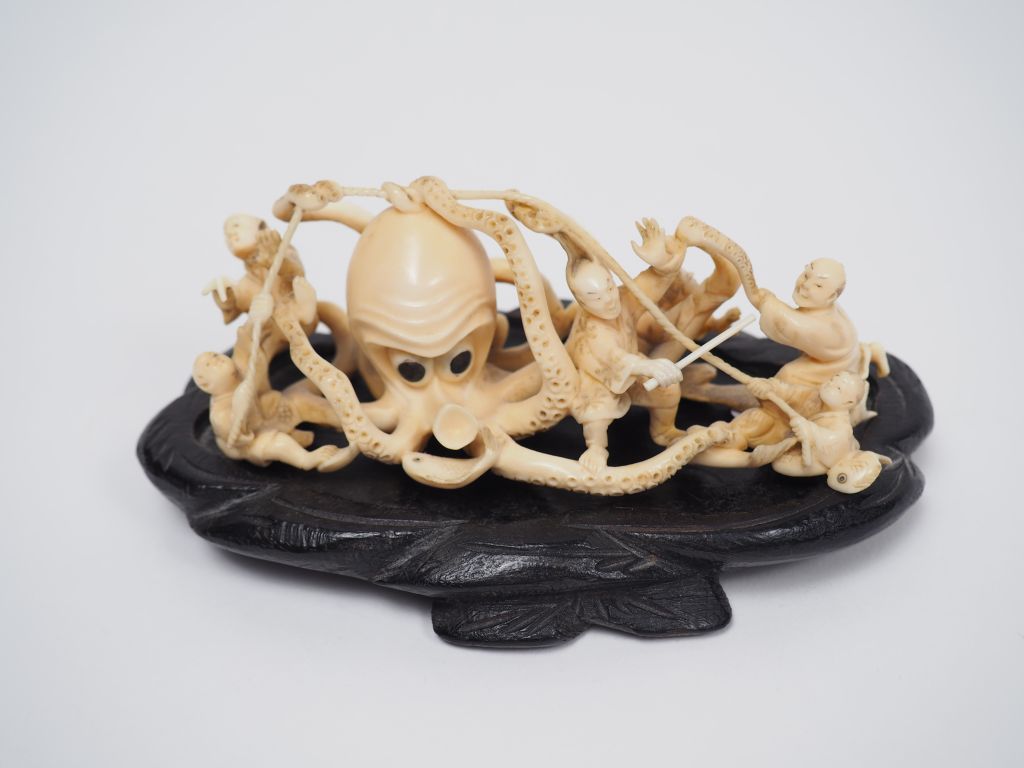 Okimono en ivoire représentant des pêcheurs attaquant un poulpe géant. Japon, vers 1920. Long. 12 cm Poids. 77 g Nom scientifique de l’ivoire : ivoire d’éléphant Elephantidae spp (I/A, pré-convention), spécimen antérieur au 1er juin 1947 et conforme à la réglementation CE 338/97 du 09/12/1996, art. 2-W mc. Pour une sortie de L’UE, un CITES de ré-export sera nécessaire, celui-ci étant à la charge de l’acquéreur.