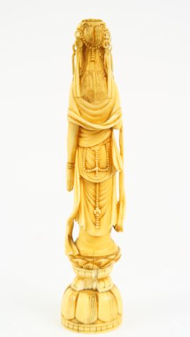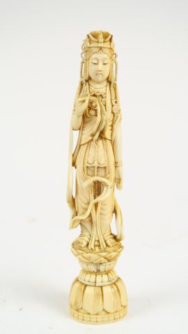 Okimono en ivoire, représentant la déesse Kannon debout sur un lotus, tenant un chasse-mouche. Japon, vers 1920. H. 19 cm Poids. 149 grs (Petit éclat) Vente aux enchères conforme aux dernières instructions (17/11/2017) du Ministère transmises par le Conseil des Ventes.