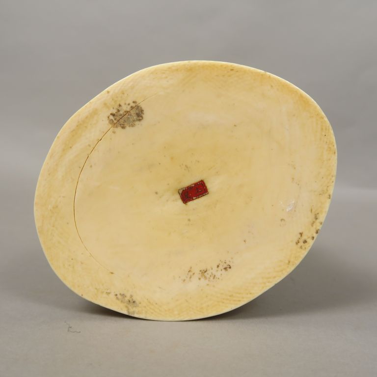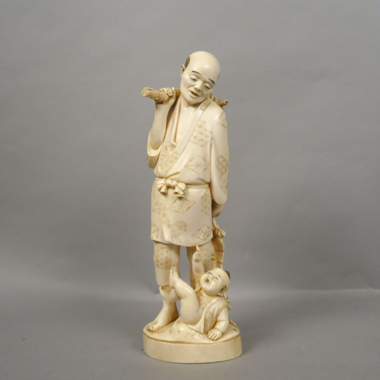Okimono en ivoire représentant un paysan portant une besace, regardant son fils qui vient de tomber. Signé dans un cachet rouge. Japon, vers 1920. H. 32 cm Poids. 1661 gr Nom scientifique de l’ivoire : ivoire d’éléphant Elephantidae spp (I/A, pré-convention), spécimen antérieur au 1er juin 1947 et conforme à la réglementation CE 338/97 du 09/12/1996, art. 2-W mc. Pour une sortie de L’UE, un CITES de ré-export sera nécessaire, celui-ci étant à la charge de l’acquéreur.
