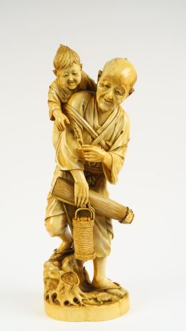 Okimono en ivoire représentant un paysan tenant une ombrelle et une lanterne, indiquant à son enfant qu’un insecte grimpe sur sa manche. Japon, vers 1900-1920. H. 40 cm Poids. 3370 grs Vente aux enchères conforme aux dernières instructions (17/11/2017) du Ministère transmises par le Conseil des Ventes.