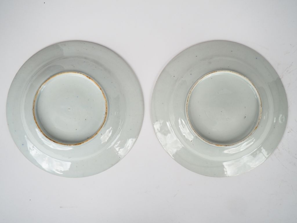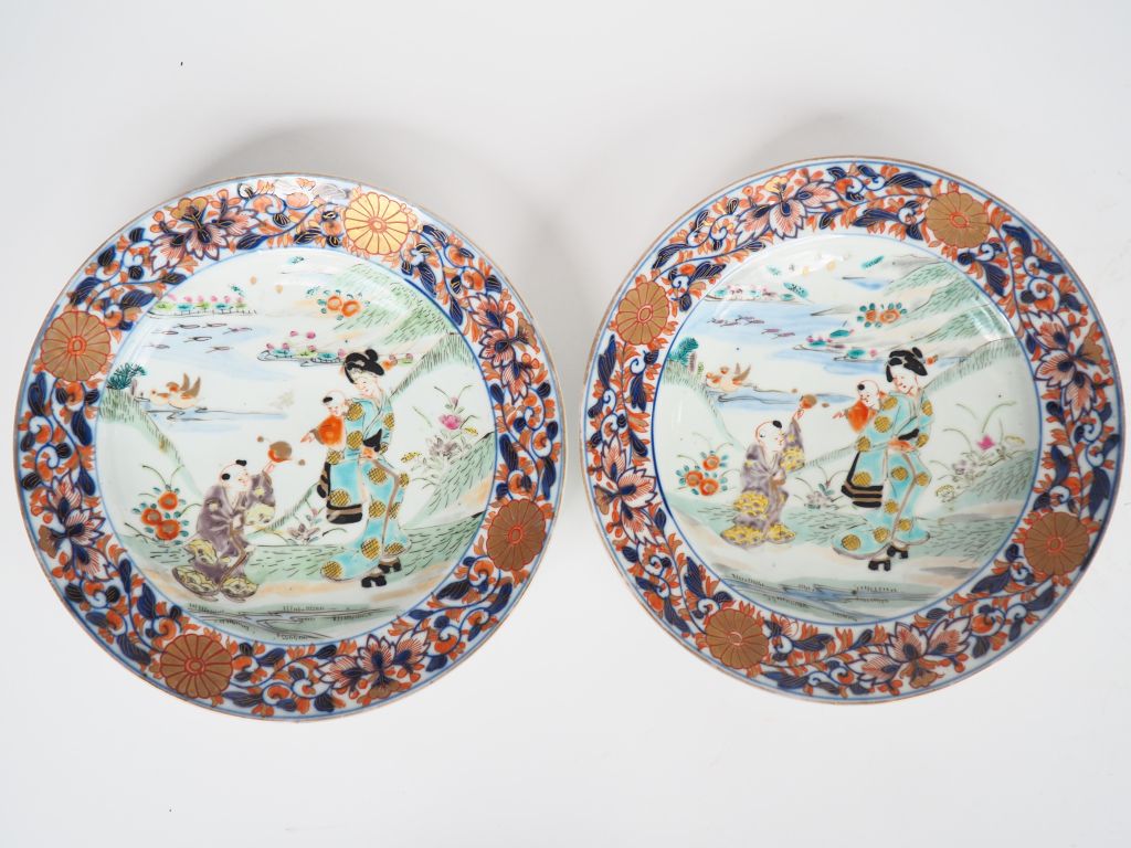 Paire d'assiettes en porcelaine d'Imari décor d'une jeune femme et d'un serviteur distrayant son enfant avec un tambourin, bordure à décor floral Japon Imari vers 1900 Diam. 25 cm