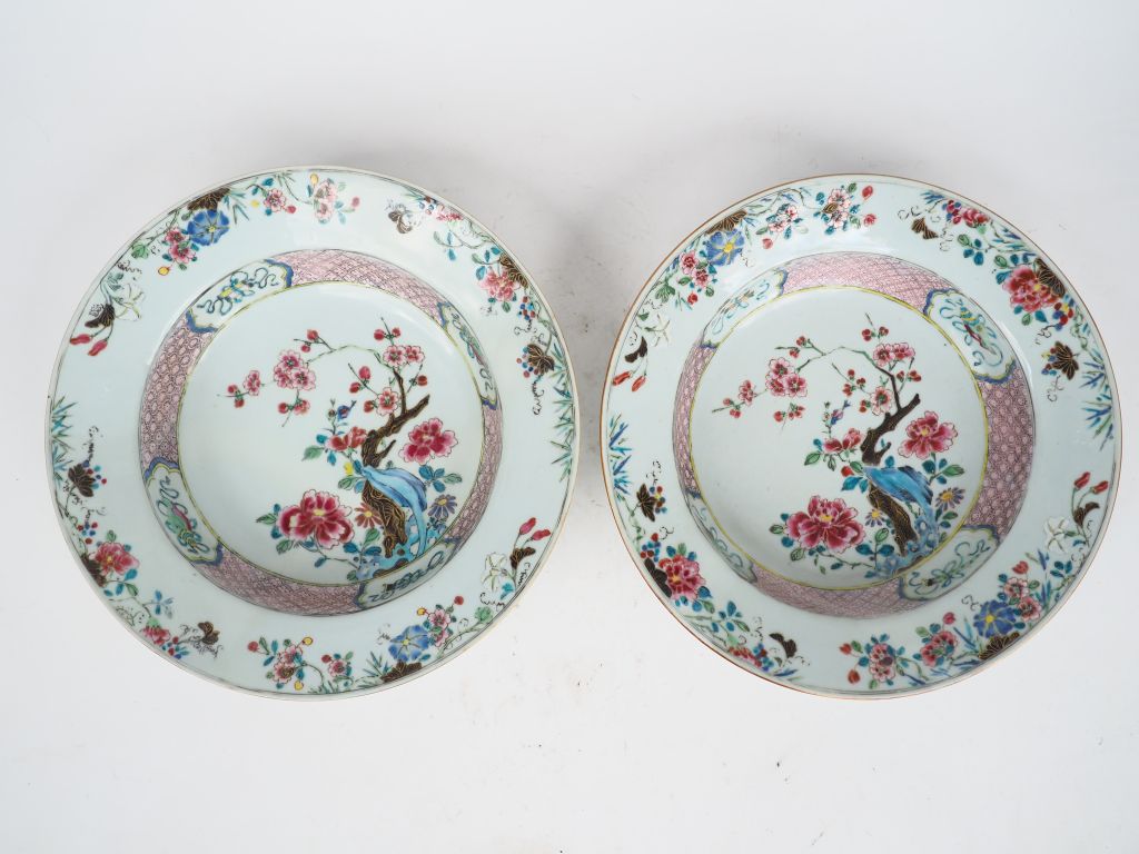 Paire de bassins en porcelaine émaux famille rose finement décorés d'un pivoinier et d'un prunus en fleurs en médaillon central Chine fin du XVIIIème Diam. 30 cm (les deux restaurés)