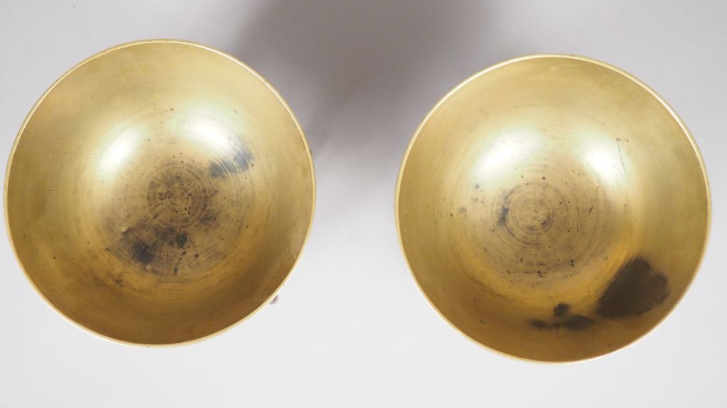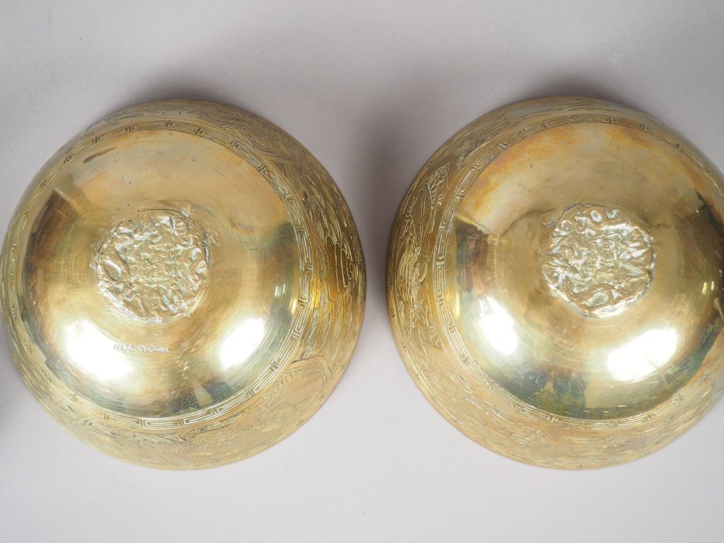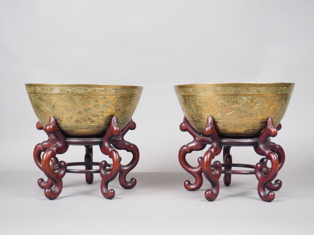 Paire de bols sonores en cuivre, à décor de dragons et phoenix. Avec leurs présentoirs en bois. Indochine, vers 1920. Diam. 24,5 cm