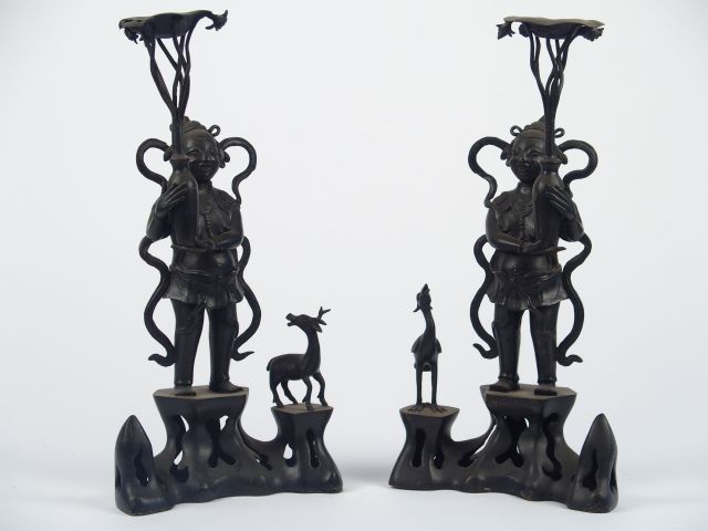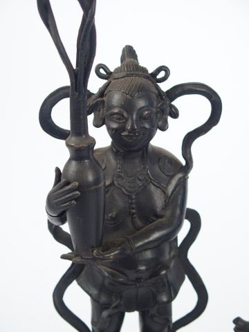 Paire de chandeliers en bronze 'Hehe tenant un vase à offrandes formant un bougeoir'. Chine XIXème