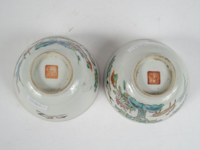Paire de coupes en porcelaine et émaux de la famille rose, à décor d'un daim et d'une grue près d'un érable et d'un pivoiner en fleurs (petit fel à l'un). Marque Tongzhi (1862-1874). Diam. : 10,1 cm