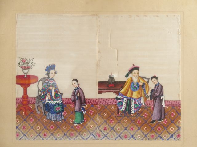 Paire de gouaches sur papier de riz. Canton fin XIXème. 32 x 41,5 cm (accidents)