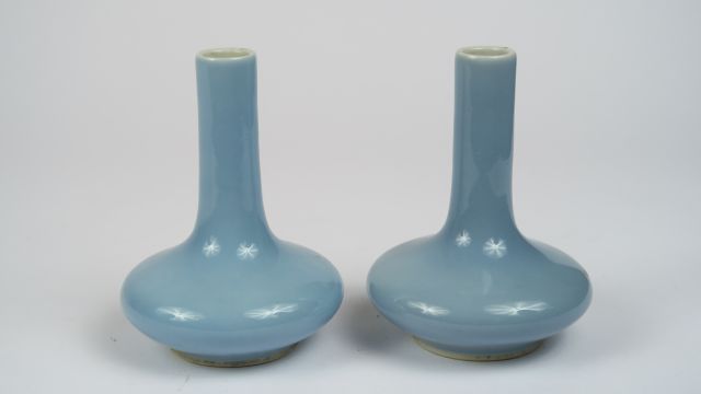 Paire de petits vases pansus à long col en porcelaine émaillée bleu lavande. Marque apocryphe Kangxi sur la base. Chine, dynastie Qing, XIXème siècle. H. 12 cm (Petites égrenures)