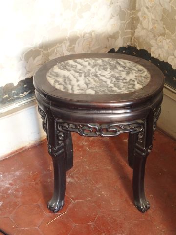 Paire de tabourets en bois sculpté, assise ovale, dessus marbre gris. Chine. XIXème (accident)