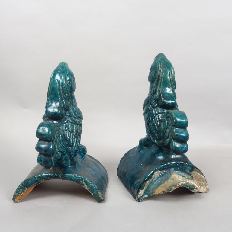 Paire de tuiles faitières en céramique émaillée bleue, représentant des oiseaux. Chine, XVII-XVIIIème siècle. H. 24,5 cm et 24 cm
