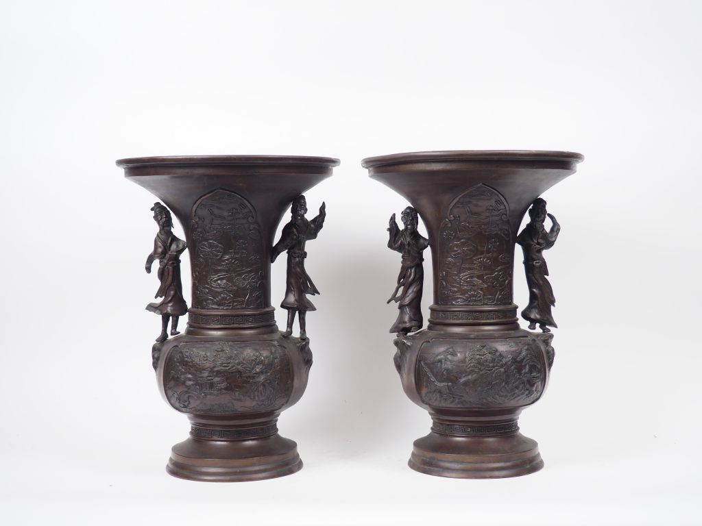 Paire de vases à large pavillon en bronze, à décor en léger relief de paysages, lotus, plantes aquatiques. Anses en forme de sages. Indochine, vers 1900. H. 46 cm