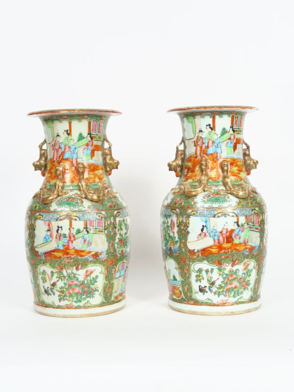 Paire de vases balustre en porcelaine de Canton, décor de scènes de palais animées de personnages, fleurs, oiseaux et végétaux, salamandres et lions en relief ornent la base du col. Chine, vers 1900. H. 36 cm