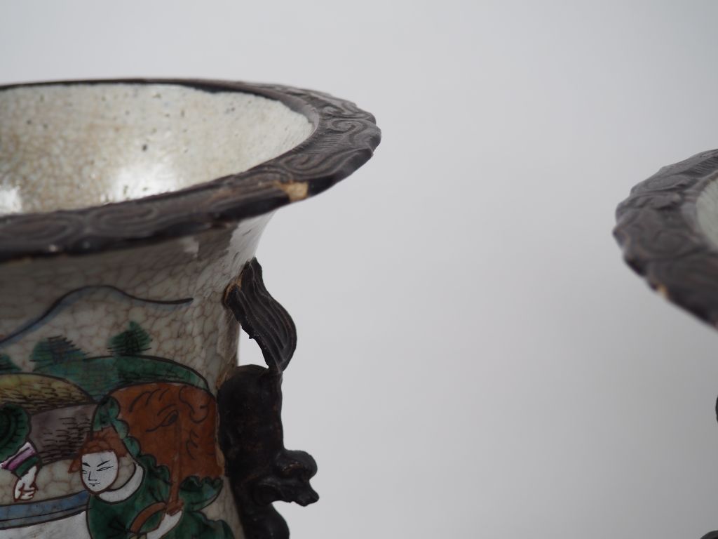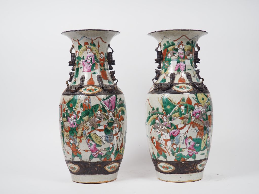 Paire de vases de forme balustre dont le col reprend la forme d'une fleur de lotus en porcelaine de Nankin, à décor polychrome sur fond craquelé beige de joutes équestres. Chine, vers 1900. H. 44 cm (quelques éclats et égrenures)