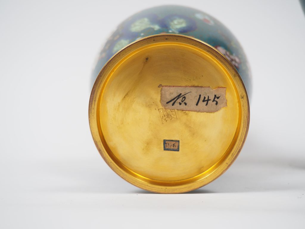 Paire de vases de forme balustre en bronze et émaux cloisonnés, à décor en polychromie sur fond bleu de pivoiniers et prunus en fleurs. Les cols ornés d'anses en forme de dragons stylisés. Chine, fin du XIXème siècle. Marques d'atelier sur la base. H. 31,5 cm