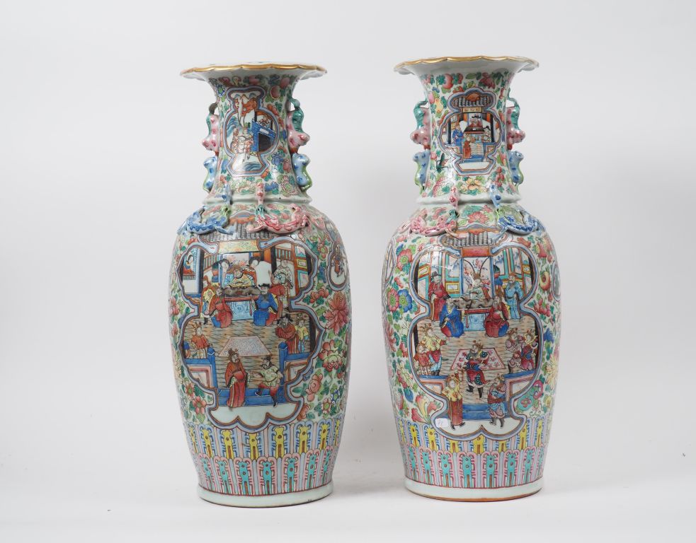 Paire de vases de forme baslustre en porcelaine et émaux de la famille rose, à décor en médaillon de scènes de palais animées de personnages, de joutes équestres, motifs de fleurs, de grenades et oiseaux fohang. Base du col ornée de dragons salamandres. Chine, vers 1880, période Guangxu. H. 60 cm (l'un d'eux fortement restauré)