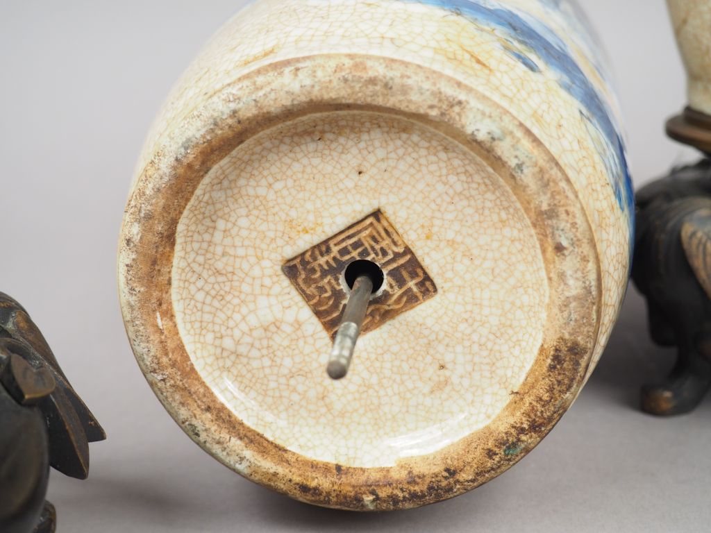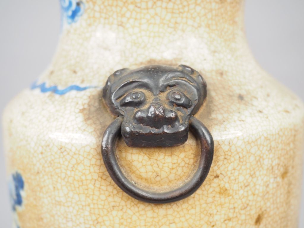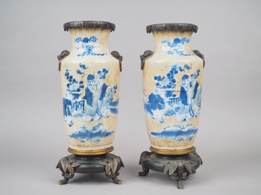 Paire de vases de forme rouleau en porcelaine, à décor émaillé bleu sous couverte sur fond craquelé beige de deux sages accompagnés d'un disciple sur une terrasse présentant une composition florale. Les anses en forme de tête de lion. Monture en bronze. Chine, Nankin, XIXème siècle. H. totale : 41,5 cm (fonds percés)