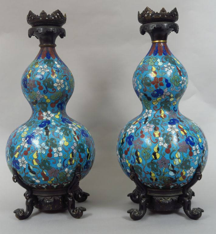 Paire de vases en forme de coloquinte en bronze et émaux cloisonnés, à décor polychrome sur fond bleu de fruits, fleurs et feuillage. Monture européenne en bronze, à décor de ruyi et de grecques. Chine, XIXème siècle. H. 44,5 cm