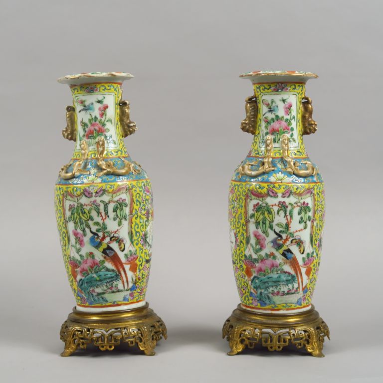Paire de vases en porcelaine de Canton, monture en bronze doré. Chine, XIXème siècle. H. 30,5 cm (accidents)