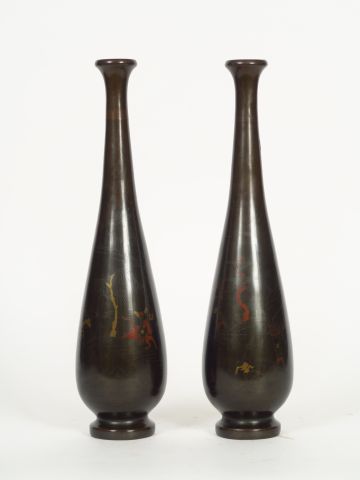 Paire de vases piriforme en bronze, décor incrusté et niellé de joutes équestres. Chine du Sud, vers 1900. H. 39 cm