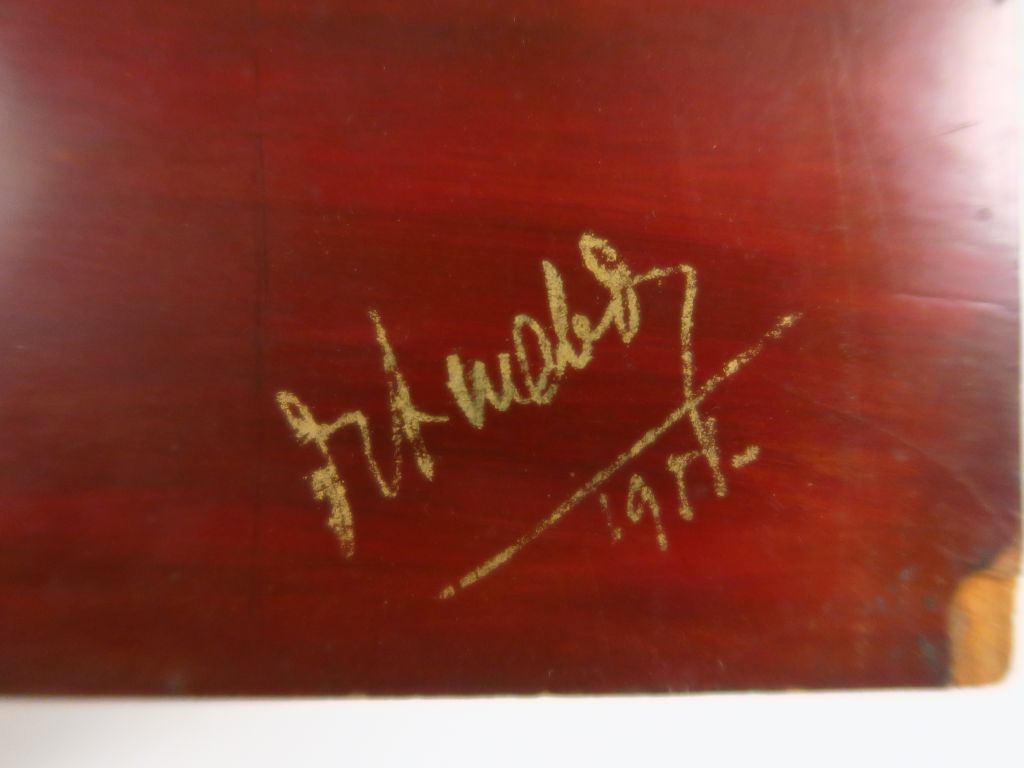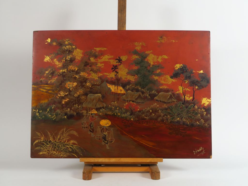 Panneau en bois laqué représentant deux femmes traversant un village entouré d'une forêt de bambous. Signé et daté. Indochine, milieu du XXème siècle. 50 x 69,5 cm