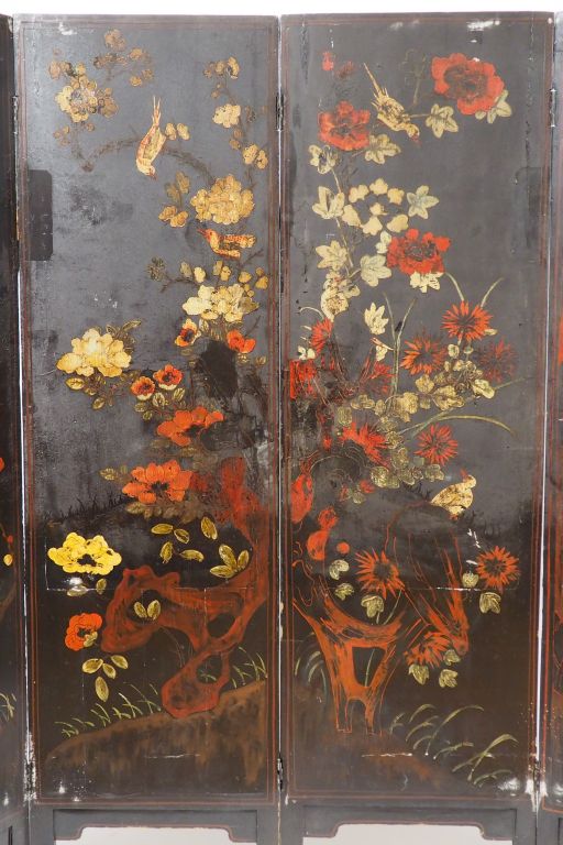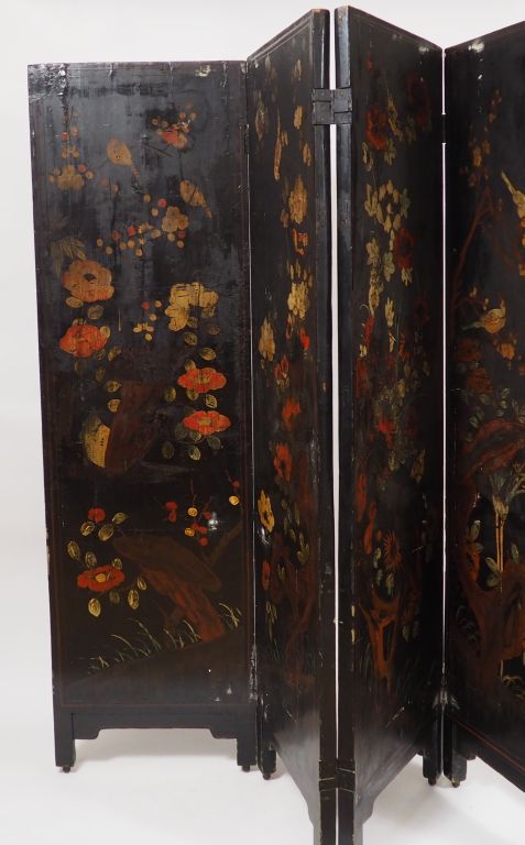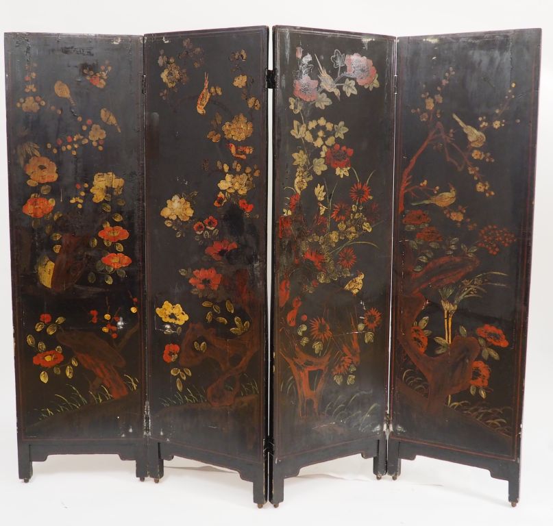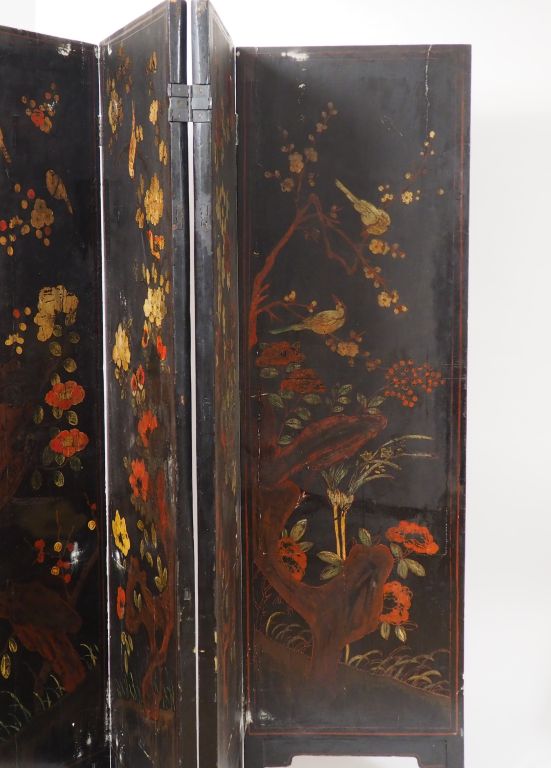 Paravent à quatre feuilles, à décor en polychromie sur fond noir d'oiseaux évoluant parmi des arbustes en fleurs. Chine, XIXème siècle. H. d'une feuille : 1,62 m Larg. d'une feuille : 48 cm