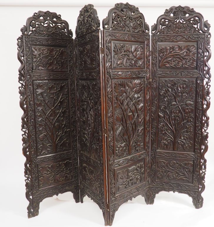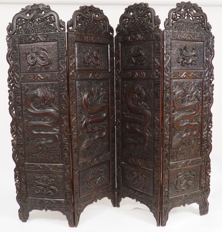 Paravent a quatre feuilles en bois anciennement laqué, à décor double faces de dragons, fleurs et végétaux. Sur les bordures l'on retrouve les caractères shu et le nœud infini. Chine, fin XIXème - début XXème. H. d'une feuille : 1,88 m Larg. d'une feuille : 54 cm