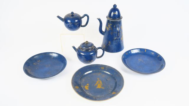 Partie de service à thé-café en porcelaine émaillée bleue poudré à décor or, comprenant : 3 assiettes, 1 cafetière et 2 théières égoïstes. Chine, dynastie Qing, période Kangxi, XVIII ème siècle. H. 23 cm ( cafetière ) Diam. 20 cm environ ( assiettes ) (Décor estompé)