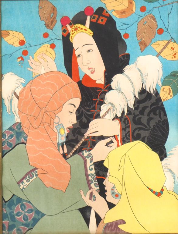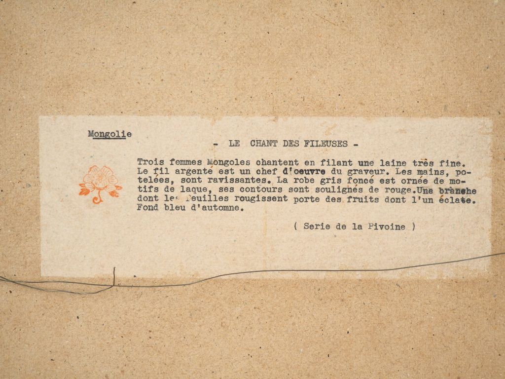 Paul JACOULET. Estampe figurant le chant des fileuses mongoles. Non signée Dim.39 x 29,5 cm