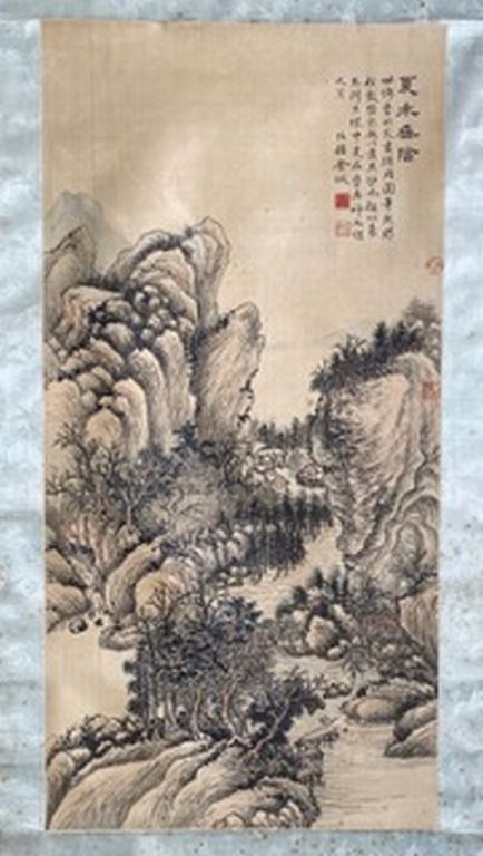 Peinture à l'encre et couleurs sur soie, représentant un paysage montagneux en été, dans lequel se trouve des maisons, une cascade et une rivière. L'inscription signifie : L’ombre des arbres en été. Chine, fin XIXème - début XXème siècle Signé Jin Cheng 1878-1926 Dim : 64,5 x 32 cm (Taches)