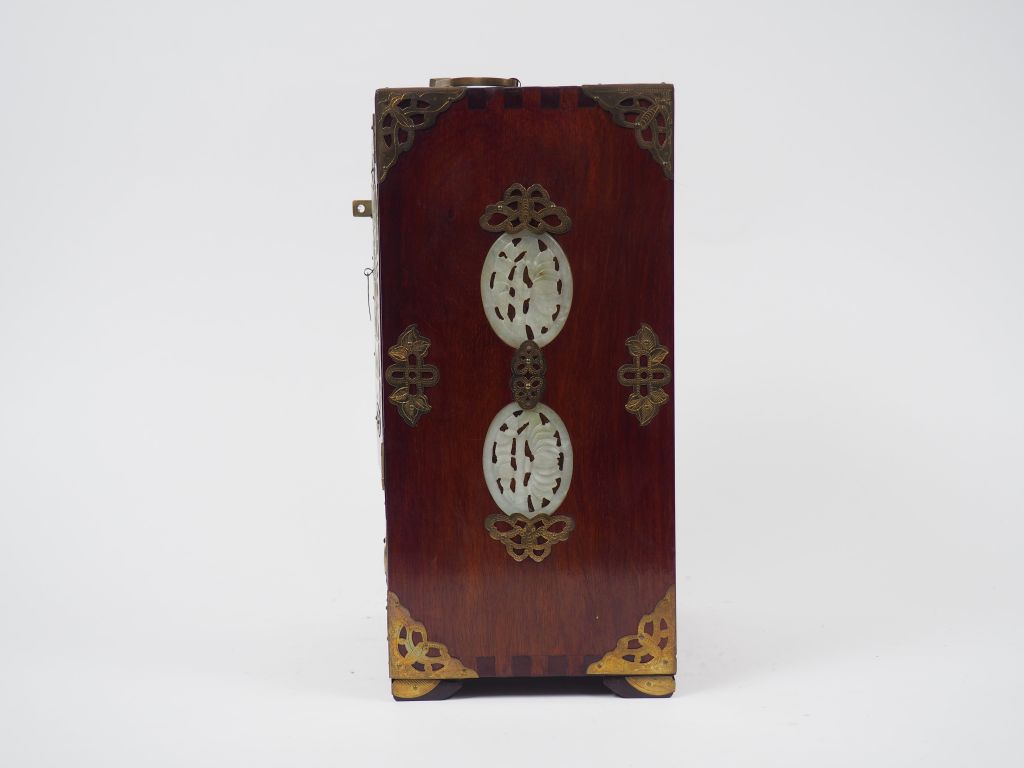 Petit coffret à bijoux ouvrant à deux portes et cinq tiroirs en bois et médaillons de serpentine. Chine, vers 1950. 32 x 20 x 15 cm