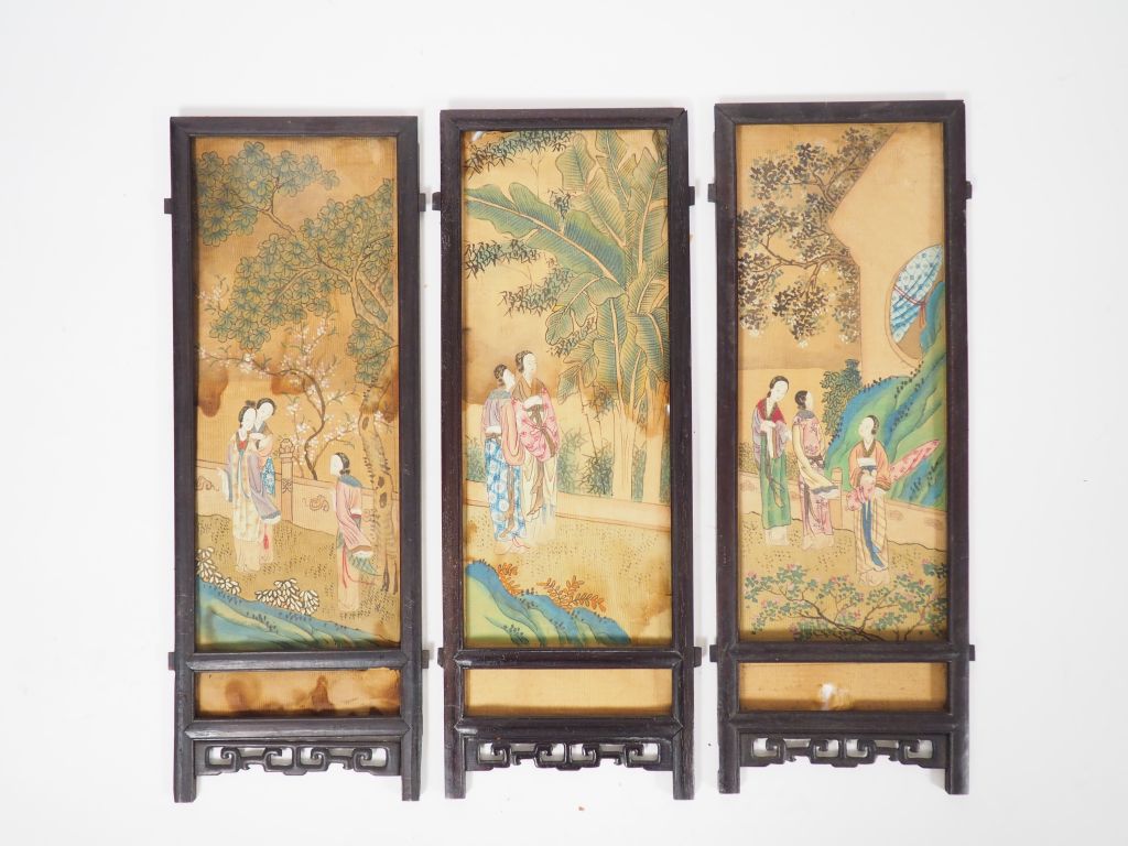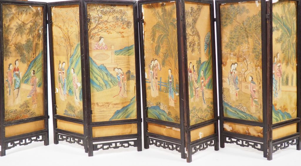 Petit paravent à sept feuilles en soie peinte, à décor de jeunes femmes dans des jardins. Chine. 42 x 17 cm (déchirures)