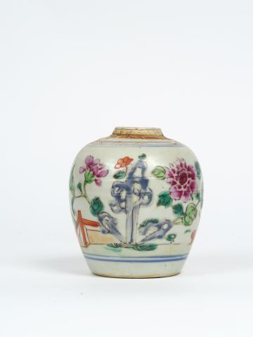 Petit vase en porcelaine famille rose, décor de pivoines. Chine XVIIIème. H. 9,5 cm (manque le couvercle)
