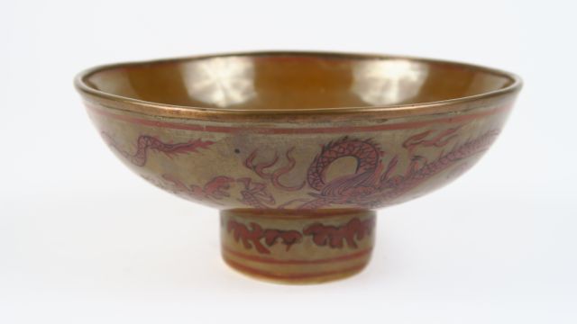 Petite coupe sur pied en porcelaine à décor rouge d'un dragon sur couverte café au lait, cerclée de cuivre. Marque apocryphe Xuande. Chine, XVIII ème siècle. Diam. 15,5 cm