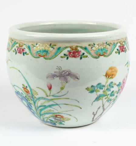 Petite vasque à poisson ou jardinière en porcelaine et émaux famille rose à décor de fleurs de lotus, de prunus et de pivoinier en fleurs. Chine, Jianqung, XIX ème siècle. H. 17 cm Diam. 21 cm (Fel au niveau de la glacure)