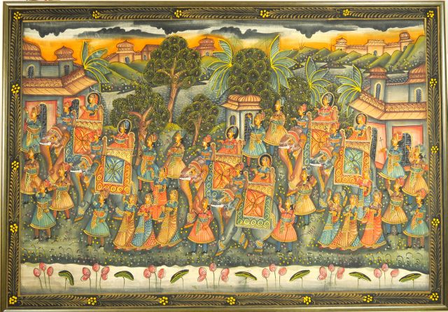 Pitchway représentant une assemblée de personnages au Rajastan dans les jardins d'un palais. Dim.