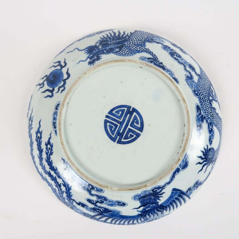 Plat en porcelaine, à décor de phenix et de dragon poursuivant la perle sacrée. Marque de la longévité sous la base. Vietnam, Xxème siècle. Diam. 36 cm (défaut de cuisson sur la marque, égrenures sur le talon)