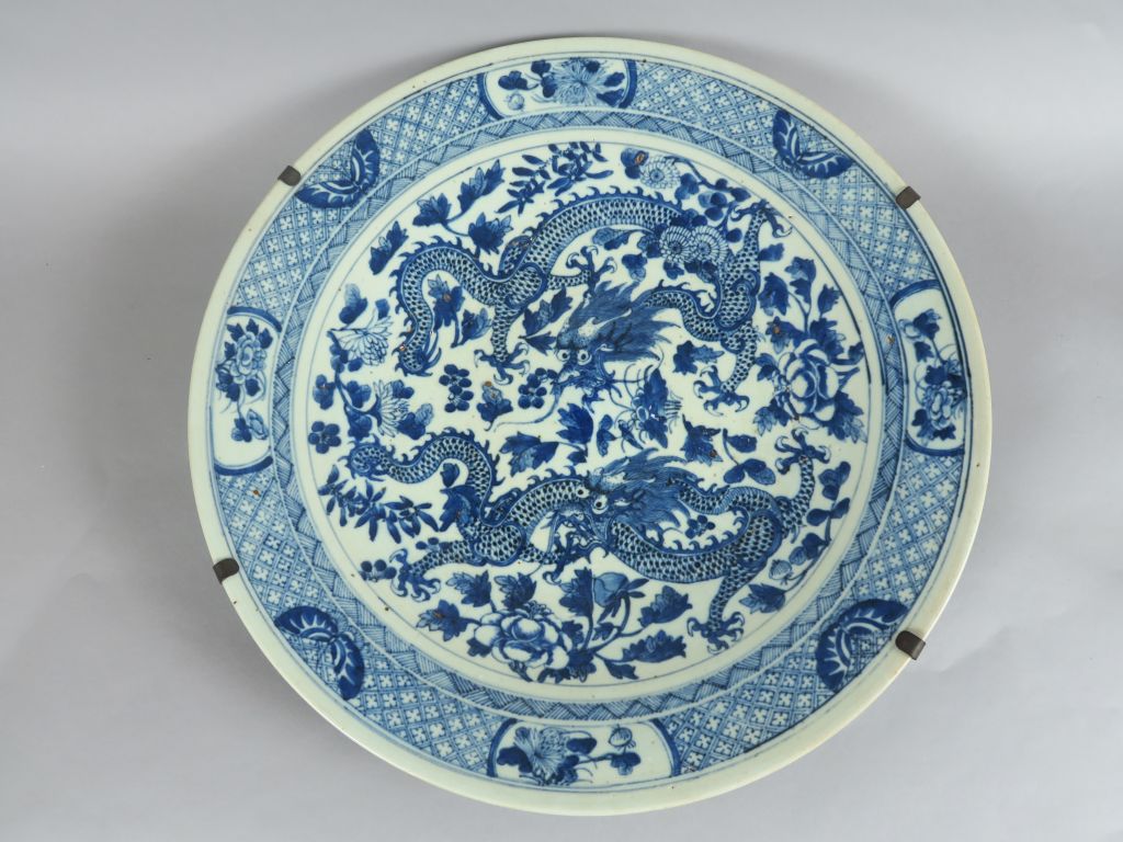 Plat en porcelaine bleu blanc, à décor de deux dragons parmi des fleurs de pivoines et chrysantèmes. Chine, vers 1900. Diam. 41 cm