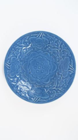 Plat rond en porcelaine émaillée bleu lavande, à décor floral moulé sous couverte. Chine, vers 1900.