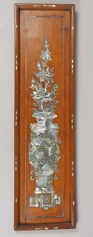 Plateau en bois de rose et incrustations de nacre, à décor de vase fleuri. Indochine, vers 1900. 65,5 x 17,5 cm (petits manques)