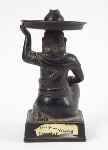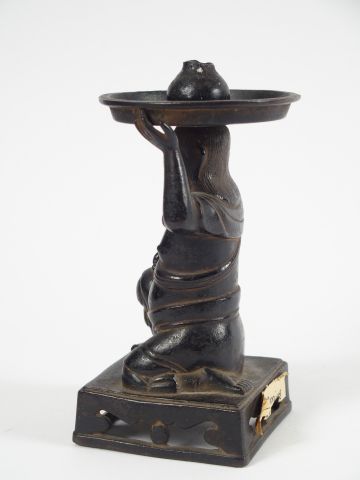 Porte baguettes à encens en bronze représentant un serviteur portant une coupe. Chine XVIIème siècle, période Ming. H. : 18,5 cm (petit manque au niveau du bougeoir)