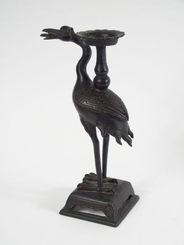Porte-cierge en bronze à patine brune, figurant un échassier supportant un vase. Chine XVIIIème siècle. H. : 28,5 cm