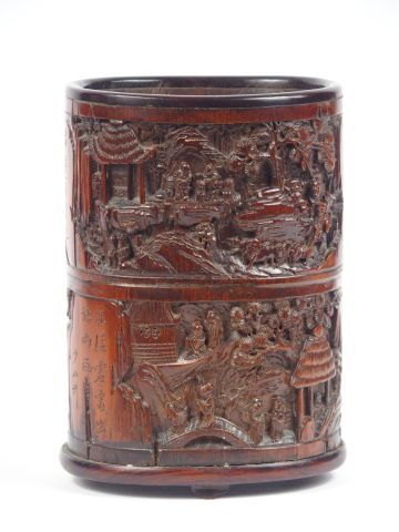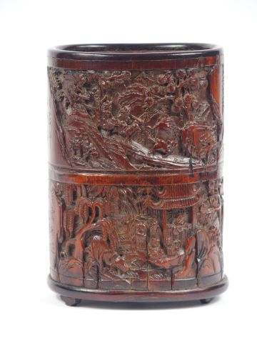 Porte pinceaux en bambou à décor d'une assemblée de lettrés auprès d'un pavillon situé dans un paysage montagneuxr traversé par une rivière. Signé Shao Shan. Chine période fin Quing/début république