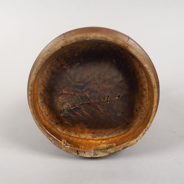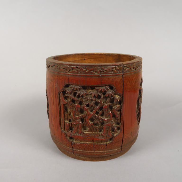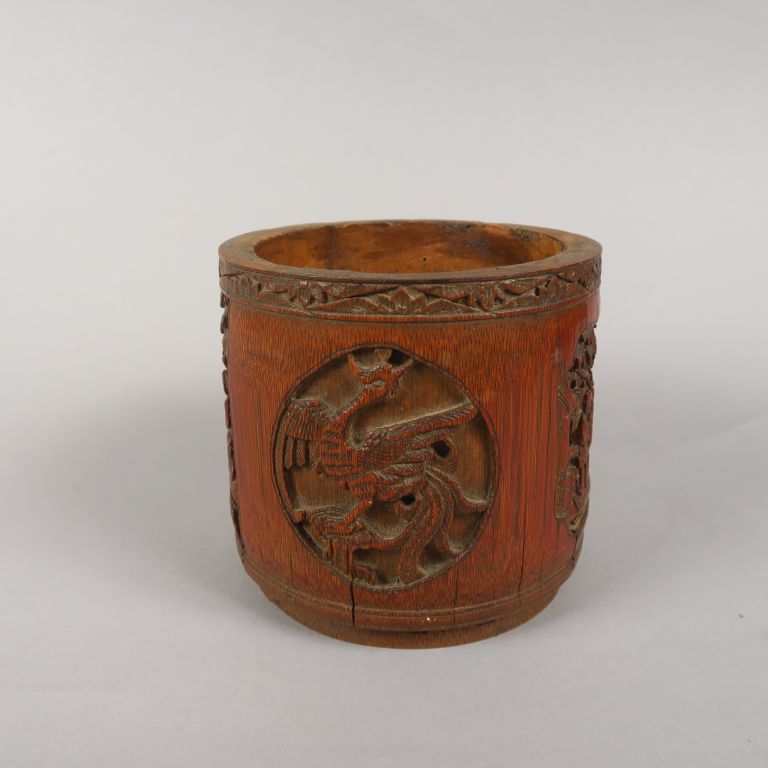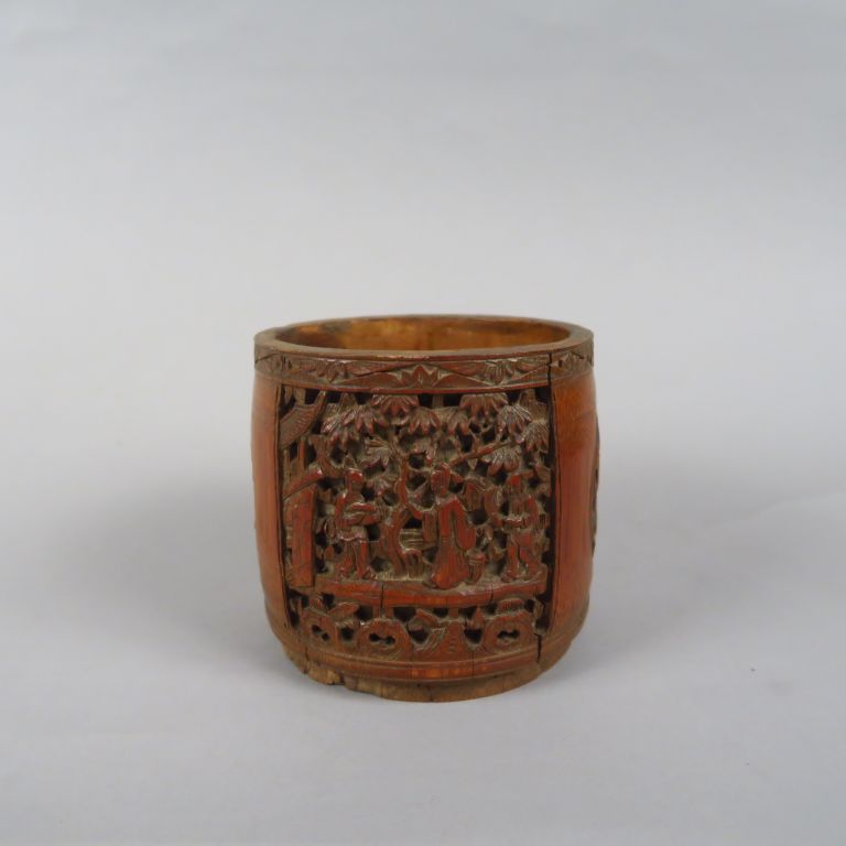 Pot à tabac en bambou, à décor sculpté de peronnages et d'animaux en médaillon. Chine, vers 1920. H. 12 cm