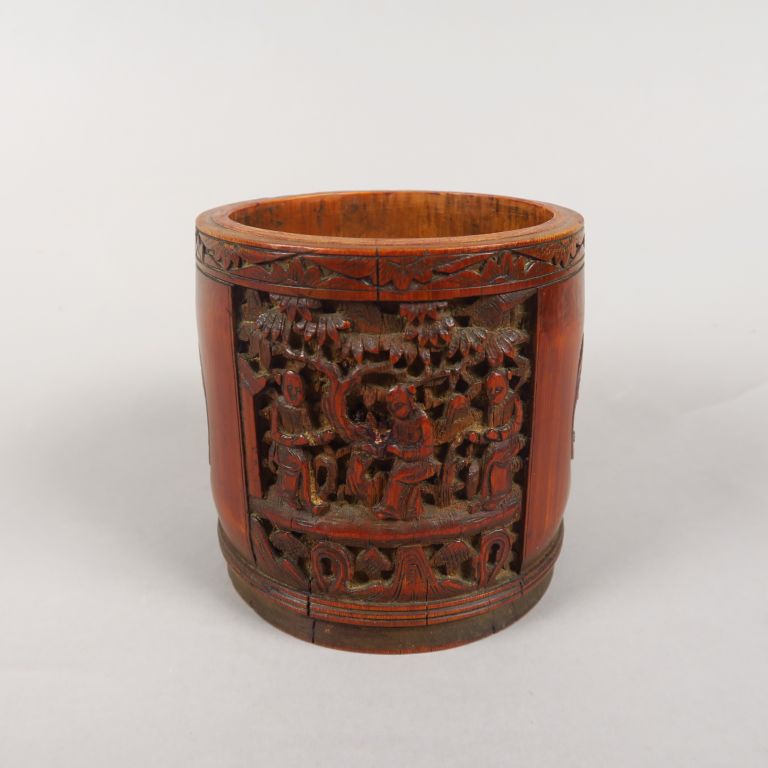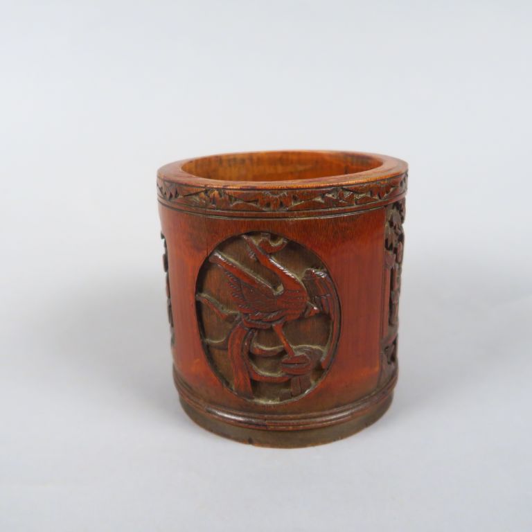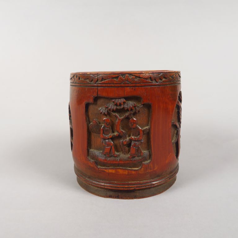Pot à tabac en bambou, à décor sculpté de personnages et d'animaux en médaillon. Chine, vers 1920. H. 11,5 cm
