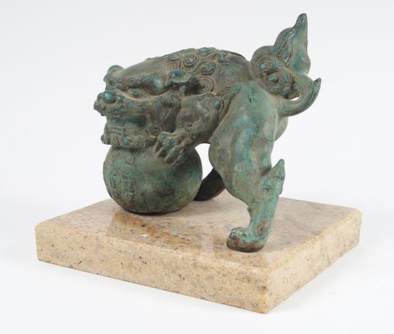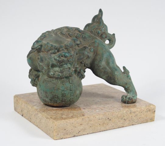 Presse-papier dont la prise est formée d'un shishi en bronze à patine verte. Japon vers 1900. H. : 16 cm
