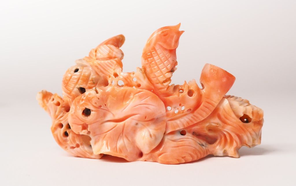 Repose pinceaux en corail sculpté d'un couple de canards mandarins et de poissons. Chine vers 1930 L. 8,5 cm Poids : 48 g