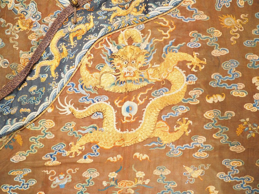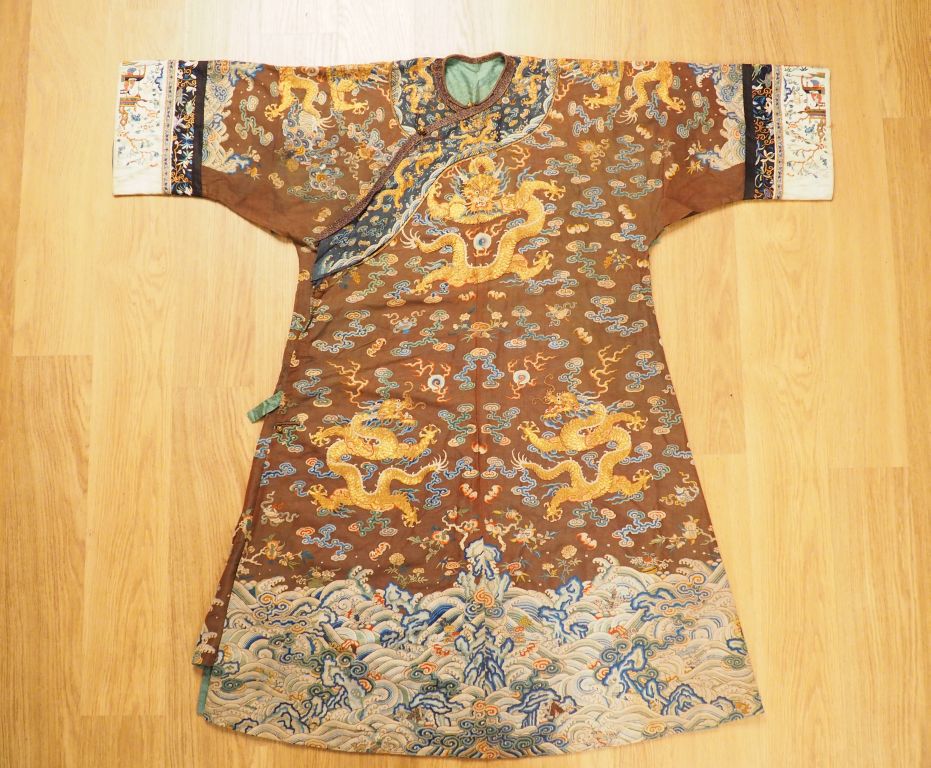 Robe d’été en voile brun brodé au fils dorés et polychromes de neuf dragons à cinq griffes parmi motifs de bon augure et nuages stylisés, au-dessus de flots tumultueux où émergent des objets précieux , le col et le bord souligné d’une bande bleu nuit ornée de dragons passant , les manches avec parements en soie crème brodée de personnages et en soie noire à motifs floraux. Doublée de soie verte. Chine, vers 1900. (Petits accrocs et trous, les parements des manches rapportés, la bordure coupée, un morceau coupé en partie basse, fils tirés, doublure tachée) H. 135 cm